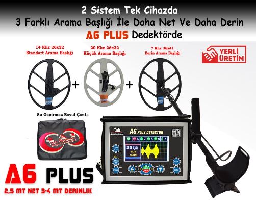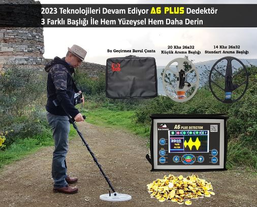 A6 Plus Dedektör, A6 Plus altın ve define aramalarında en derin altın bulucu define dedektörlerinden biridir. A6 Plus fiyatı, özellikleri, derinlik hesaplaması ve daha birçok özellikleri olan tam donanımlı altın arama dedektörüdür. A6 Plus toprak ve kaya içerisindeki altın paraları ve toprak içine ya da kaya içine yapılmış olan oda mezarları, tünelleri, mahzenlerin tespitlerini 2.5 metreye kadar net 4 metreye kadar da maksimum derinliklerden tespit yapabilme özelliklerine sahiptir.