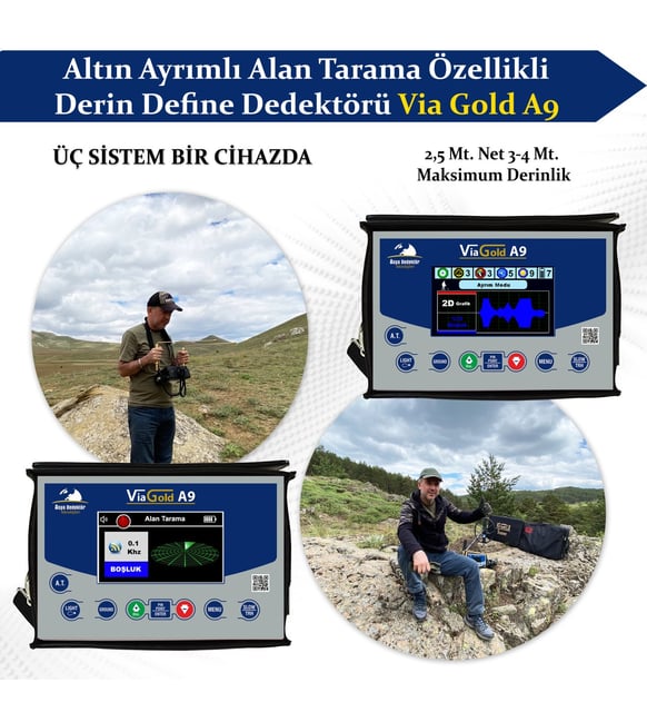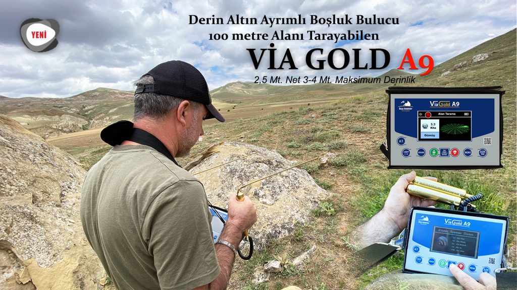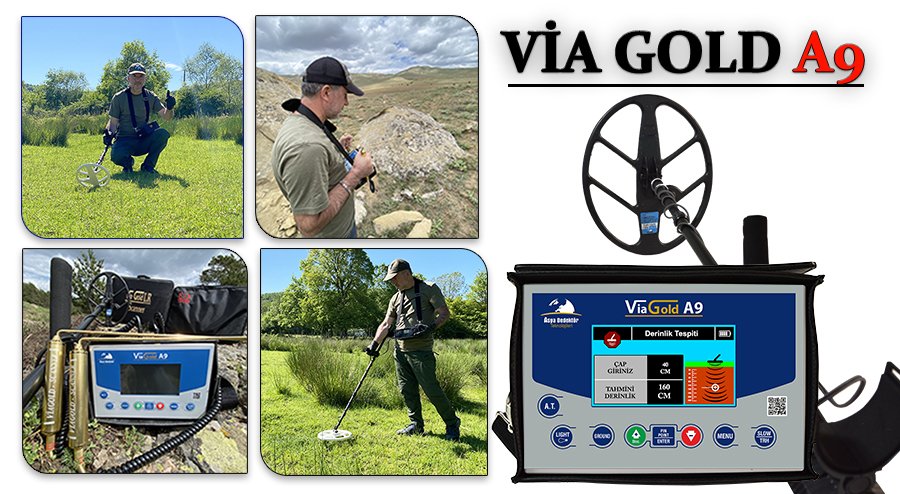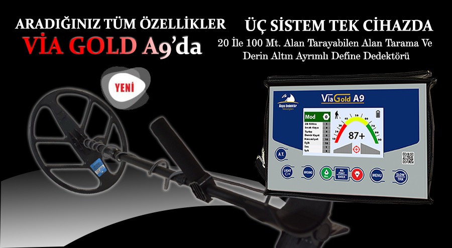 Via Gold A9 altın arama dedektörü, 60×60 7 khz arama başlığı ile yer altında oda mezarlarını, tünel girişlerini, kayanın içindeki kül büyükçe altın ve hazineleri, define işareti yapılmış Ermeni, Rum hazine ve definelerini, Roma, Bizans, Yunan altınlarını, gümüş, Bronz, tunç, metal obje ve heykelleri 20 santim ile 3 metre derinlikten tespit edilebilmektedir.