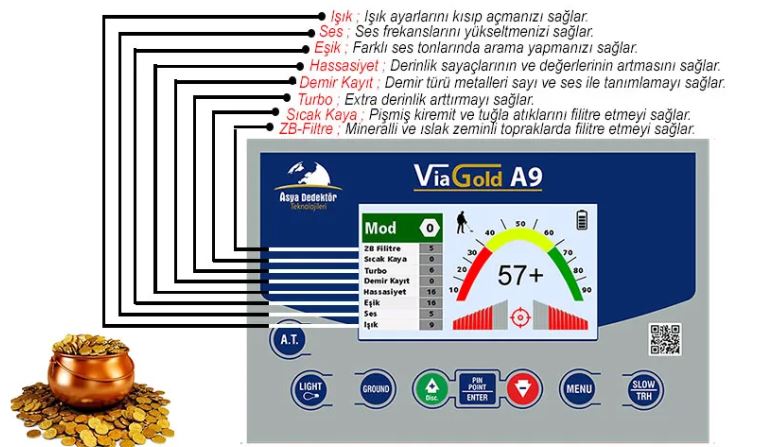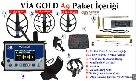 Via Gold A9 define dedektörü, ergonomik tasarımı ve şarj edilebilir uzun pil ömrü haricinde renkli ekranı, optimize edilebilir ses, ışık ayaların arazi koşullarına göre istenilen özelliğin devreye alınması ile üstün performans sağlamaktadır.
